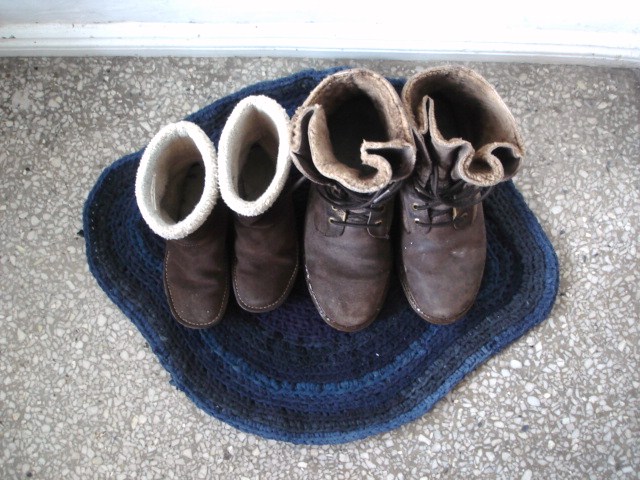 Wir haben hier nun bald sechs Wochen ununterbrochen Schnee, ein Ende ist nicht abzusehen. Zeit, sich endlich auf den Zustand einzustellen,  zum Beispiel mit dieser Schneestiefel-Abtropfstation.  Aus meinem Fundus einsamer, löchriger Socken habe ich die Blautöne herausgesucht, schöne lange Streifenspiralen geschnitten und dann mit festen Maschen eine Matte gehäkelt. Ein blaues T-Shirt konnte ich auch noch verwerten.