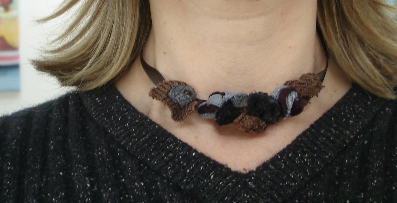 • Die gar nicht schnelle aber sprunghafte Bloggerin hat jetzt die Sockenkette nochmal zum Vergrößern reingestellt. Es sind einfach nur zusammengerollte Reste von der Sockendecke (Eintrag vom 24.1.10), Teile der Bündchen z.B., die habe ich auf ein Satinband genäht. Ich mag Stoffschmuck, weil mich anderer oft stört.