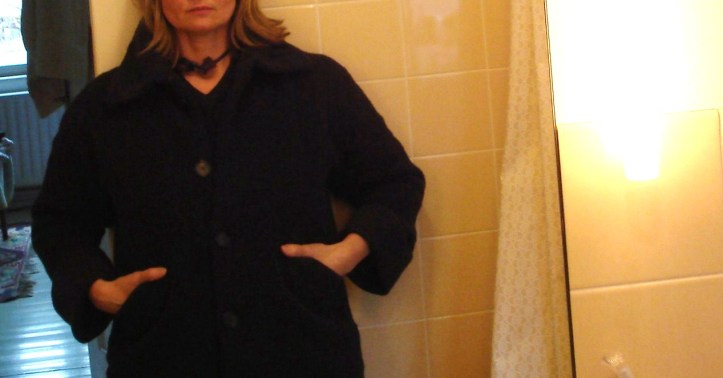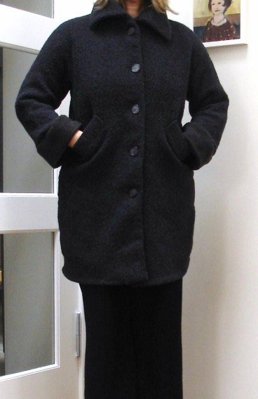 Nach einer schön heißen Waschmaschinenwäsche ist er nun sensationell geschrumpft – die Ärmel so kurz, dass ich einen breiten Aufschlag (aus einem gefilzten Pullover) annähen musste. Die Taschen liegen mindestens zwanzig Zentimeter über ihrer ursprünglichen Position. Alles ist etwas beulig, aber der Mantel gefällt mir wesentlich besser als vorher.  Der nächste Winter kann kommen!