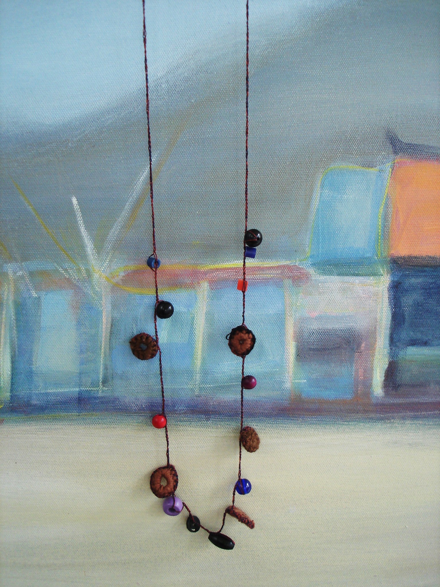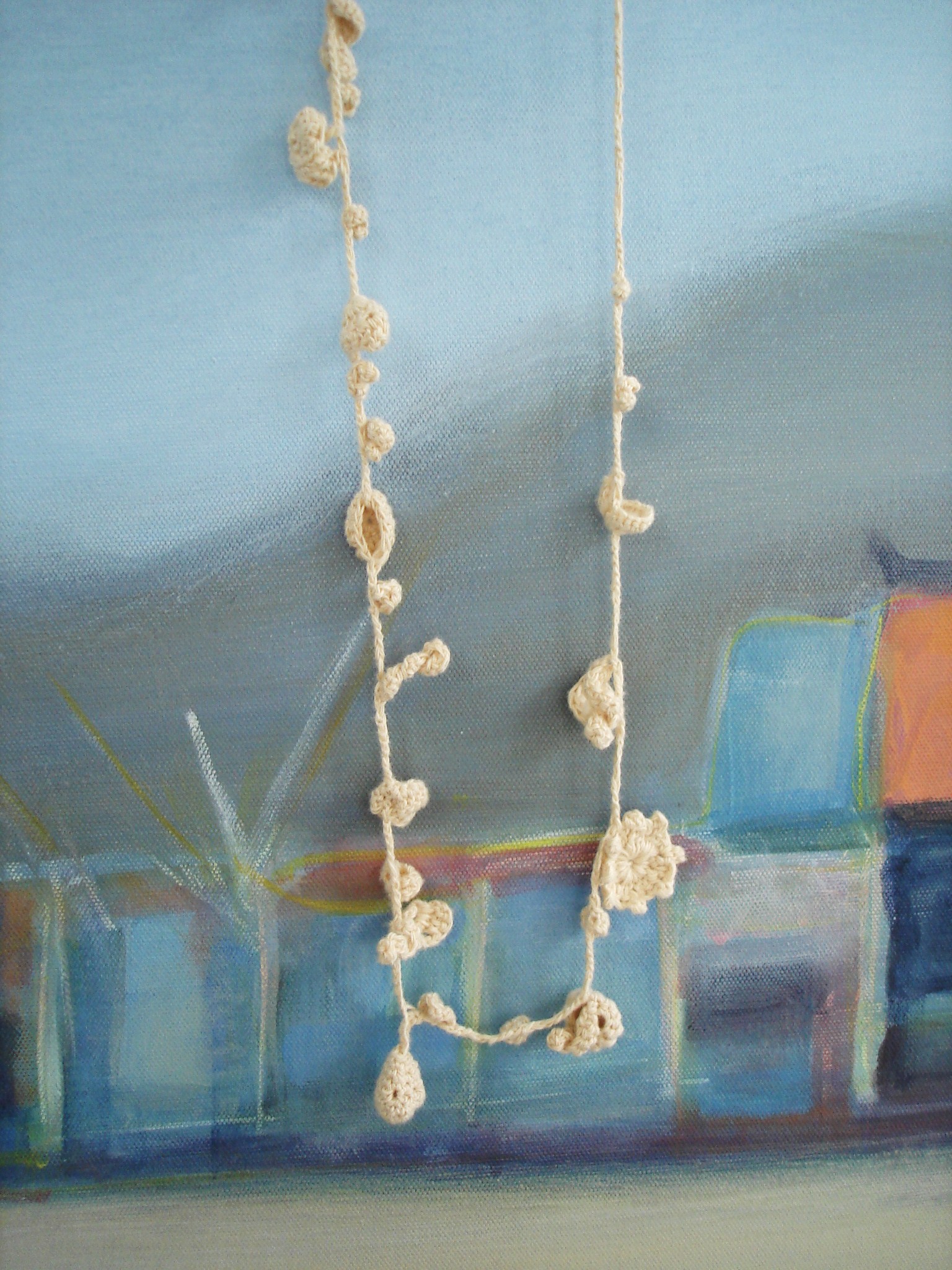 Am Häkeln mag ich so gern, dass man sofort sieht, was man macht und sich quasi bei jeder Masche neu entscheiden kann, in welche Richtung das Häkelstück gehen soll.  Auf diese Art habe ich zwei Ketten gemacht, die sehr angenehm zu tragen sind.