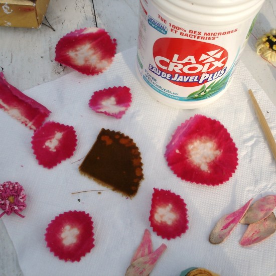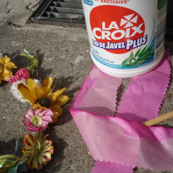 In meinem Fall habe mir aus Frankreich die Putzlegende „Eau de Javel“ mitgebracht. Alles Wissenswerte zu diesem gechlorten Nationalheiligtum der Franzosen steht in diesem Karambolage-Beitrag. Im Leben hätte ich nicht gedacht, dass ich so eine Flasche einmal kaufen würde, aber im Dienste der kreativen Forschung konnte ich mich überwinden. Und siehe da, ich bin versöhnt, denn das Putzmittel läßt sich nicht nur antibakteriell, sondern auch schöpferisch einsetzen.