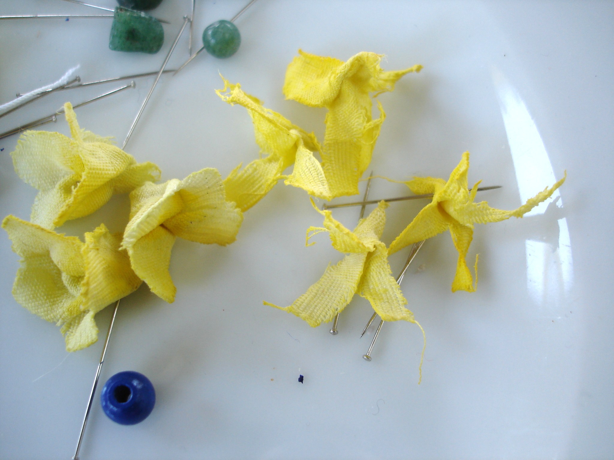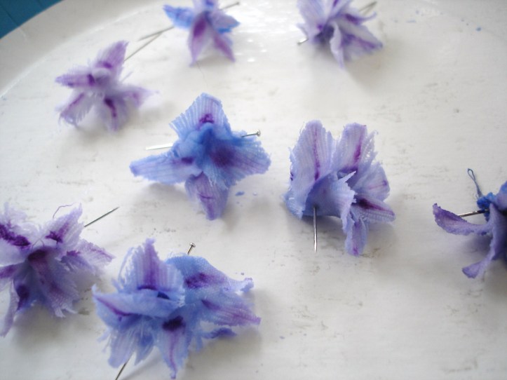 Danach habe ich die Stoffstreifen je nach gewünschter Blütenform in Stücke geschnitten und zusammengerollt, etwas geformt, mit einer Stecknadel gesichert und trocknen lassen.