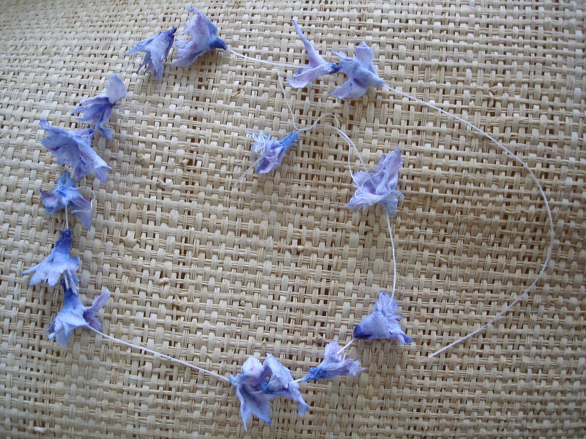 Das war nicht meine Absicht. Damals hat man dem Glanz mit Wachs und anderen Zusätzen nachgeholfen, aber das will ich erstmal nicht weiter verfolgen.  Denn mein Traum einer Kette von zarten Hyazinthenblüten war nach dem Aufreihen der kleinen „Papierblumen“ ausgeträumt: Es sieht aus wie eine billige Hawaiikette. Nur gut nachahmen ist eben nicht alles.  So verlasse ich das Terrain der traditionellen Herstellung künstlicher Blumen zunächst wieder. Es ist aber faszinierend, einem 150 Jahre alten Anleitungsbuch zu folgen!
