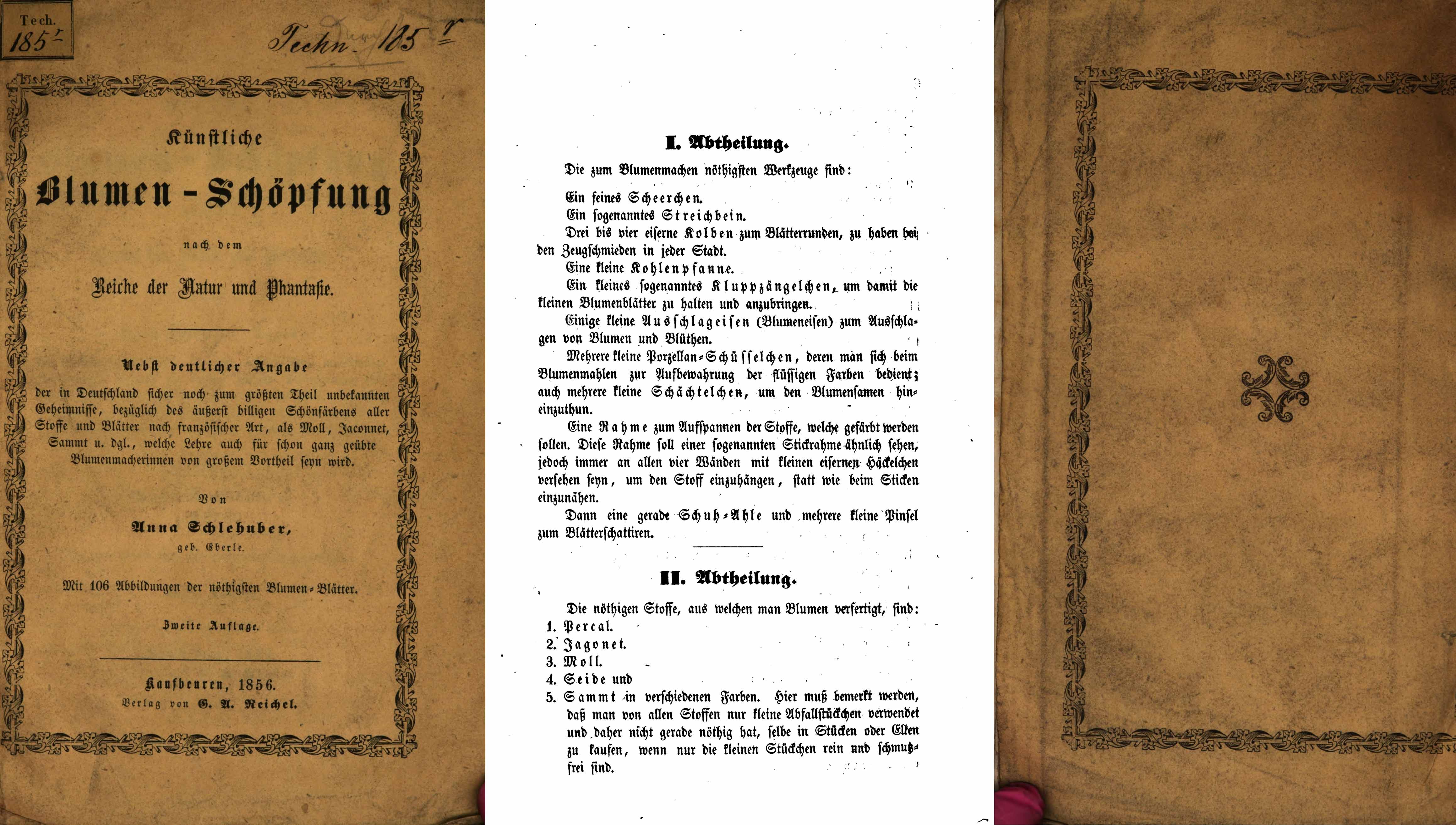 „Wie unentbehrlich künstliche Blumen sind, bedarf wohl kaum einer Erwähnung , denn kurz ist die Zeit der Kinder Flora’s und man würde oft bei ihrem Verschwinden untröstlich seyn, wäre es nicht schon lange dem Fleiße gelungen, durch künstliche Nachahmung und Farbenpracht sich einigen Ersatz zu verschaffen; und wirklich hat es das rastlose Bestreben des immer sinnenden Geistes, die fleißige geschickte Hand hierin bereits zum Erstaunlichen gebracht.“