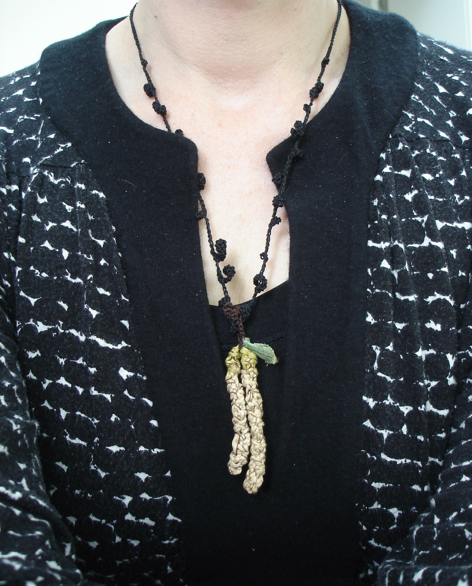 Hin und wieder schauen meine Eltern ja auch mal hier in den Blog. Mein Vater schickte mir dieses Foto aus dem heimatlichen Garten, und da musste ich mich gleich daran machen, die grünen Häkel-Blütenstände von hier etwas reifer werden zu lassen. Entfärbt und dann mit Tee etwas getönt trage ich sie nun um den Hals herum. Sehr alltagstauglicher Schmuck, wie geplant.