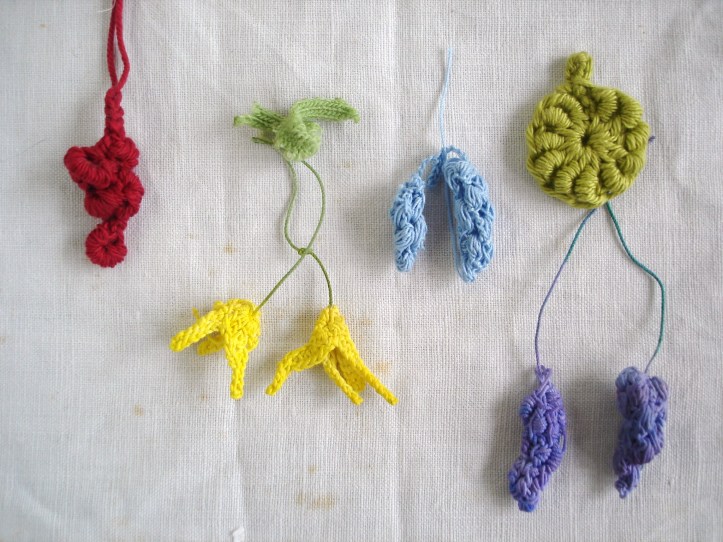 In verschiedenen Ausführungen hier u.a. die Boullionmasche, die bei Lucies Häkelborte schon Thema war.  (Ich habe es mit dieser Variante probiert).  Oben links die rote Rispe und die Brosche unten sind von Büschen inspiriert, die ich in der Nachbarschaft gesehen habe. Kann es sein, dass sie „Blutjohannisbeeren“ heißen? Das gefällt mir ja sehr gut.