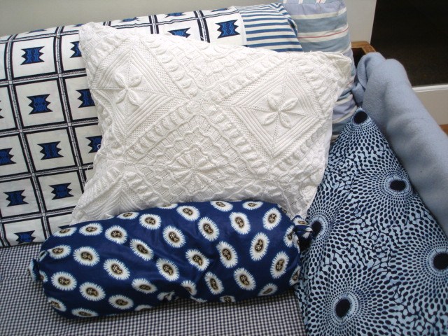 … ist dieses Sofa, sonst nichts. Mit afrikanischen Stoffen habe ich mir eine kühlende blau-weiße Insel geschaffen. Dort werde ich liegen und abwarten, während meine Umwelt vorm Fernseher hockt.
