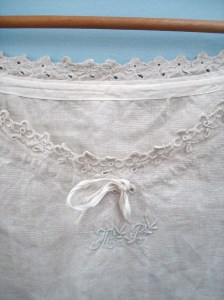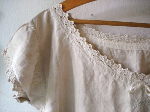 6. Die „schonen-oder-benutzen“-Frage stelle ich mir auch immer wieder – inzwischen tendiere ich eher zu „benutzen“, denn es ist ja nicht der Sinn der Dinge, nur generationenlang in Schränken und Schachteln aufbewahrt zu werden. Könnte man das Nachthemd nicht mit einem farbigen Leinenrock darunter, mit Gürtel und vieleicht einer Strickjacke als Oberbekleidung tragen? Ich kann mir auch vorstellen, dass das ein Paradestück war, und deshalb nie getragen wurde, die Lochstickerei muss Wochen in Anspruch genommen haben.