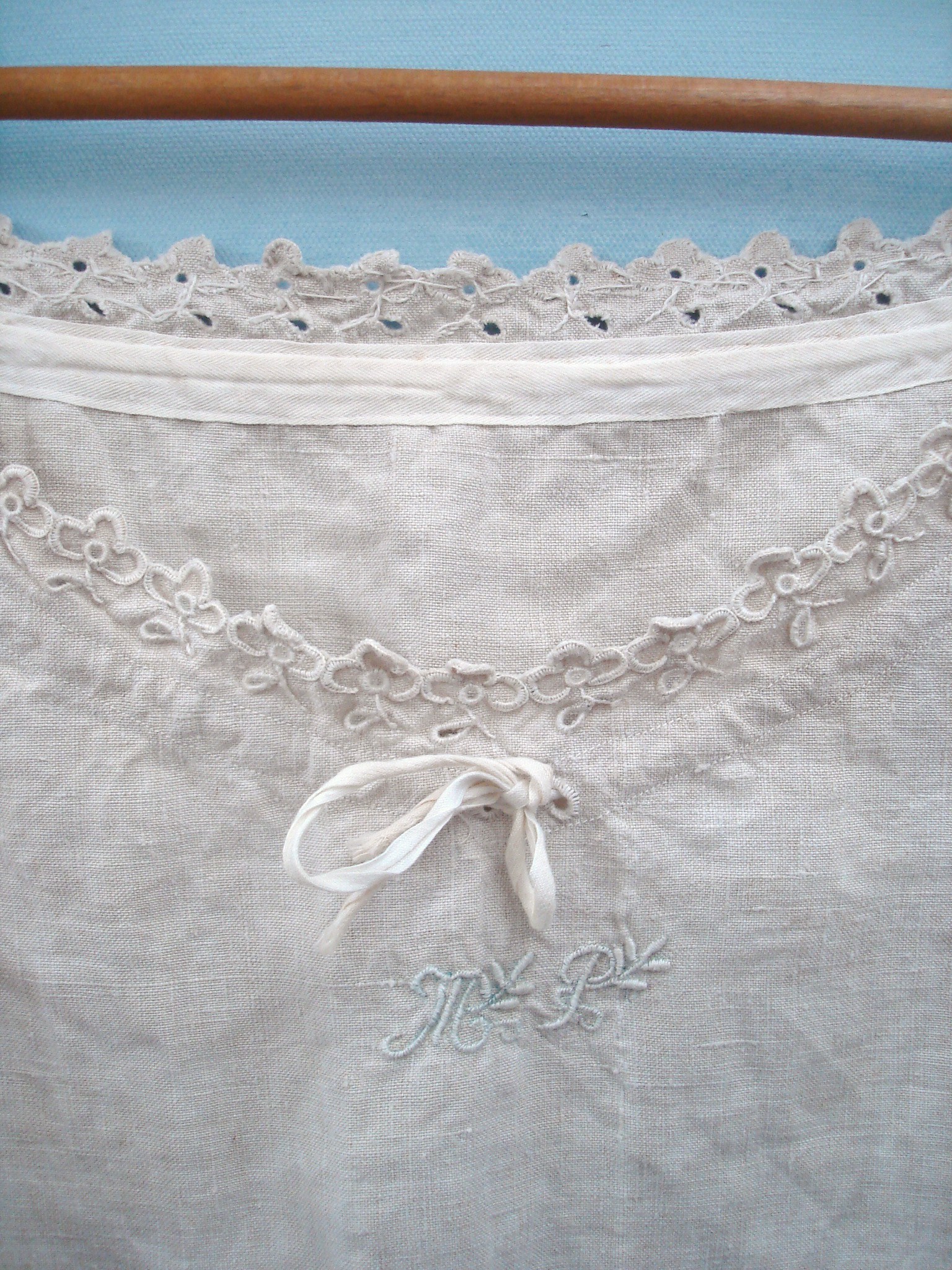 Das Nachthemd ist zum größten Teil  mit der Hand genäht, auch die Lochstickereien am Halsauschnitt und an den Ärmeln sind handgemacht. Durch das Monogramm unterhalb der Schleife scheint noch die blaue Vorzeichnung für die Stickerei hervor.  Alle handgenähten Stiche, auch die für die Kappnähte, mit denen die Teile zusammengenäht wurden, sind sehr klein und regelmäßig, kaum zu sehen.