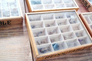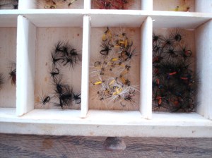 Die Boxen mit der Aufschrift „Redoutable“ stammen aus einem schon vor langer Zeit aufgelösten Angelgeschäft und enthalten nachgemachte Fliegen. Fliegenfischen ist eine Art des Angelns, bei der imitierte Insekten u.a. Getier als Köder benutzt werden. Die Köder werden sehr aufwendig in Handarbeit hergestellt.