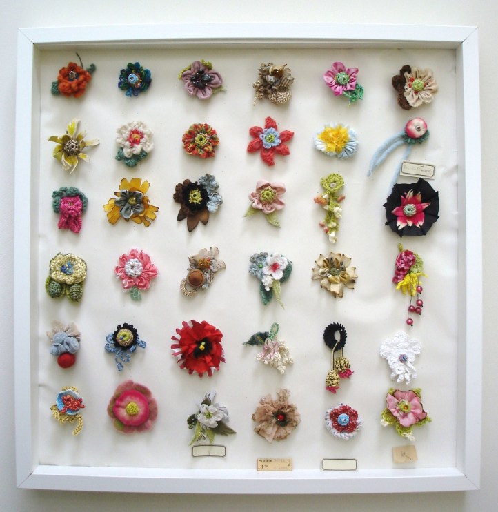 Wer sich noch an diesen Eintrag  erinnern kann, der wird sich vielleicht freuen,  dass das Projekt Blumenkasten nicht halbfertig liegen geblieben ist.   36 Broschengestecke füllen den Rahmen nun.  Mit den Namensschildchen probiere ich noch herum, aber ich glaube, die lasse ich weg, um den Gesamteindruck nicht zu stören.