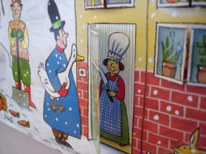 Alte Kalender aus den Vorjahren hängen wir erneut auf, die Türchen werden so gut es geht wieder verschlossen. Diesen von der Illustratorin Rotraut Susanne Berner mag ich besonders gern. Hinter den Türen geht eine Geschichte immer weiter. Unten sieht man zum Beispiel, wie die Gans kurz vor der Schlachtung steht.