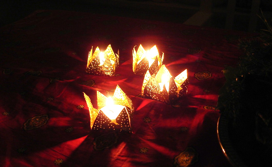 Ellens Adventskalender sei Dank bin ich letztes Jahr auf diese Anleitung gestoßen, in der aus Teelichtern Alusterne entstehen. Ich habe das Prinzip auf Katzenfutterschalen übertragen. Daraus lassen sich dann zum Beispiel wieder Teelichthalter machen, die im Dunkeln ein schönes Licht werfen. Oder man verschönert eine Energiesparbirne damit, wie auf dem Foto oben.