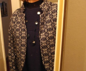Und ich dokumentiere hier auch noch einen Verstoß gegen die „Ich kaufe mir keine neuen Klamotten solange ich noch alte habe“-Regel. Plötzlich fand ich diese Jacke und weil ich genau so ein Muster schon immer wollte und ich es mir auch nicht selbst hätte stricken können, habe ich nun ein neues Teil (zu dem die Kette zufällig ganz gut passt).