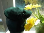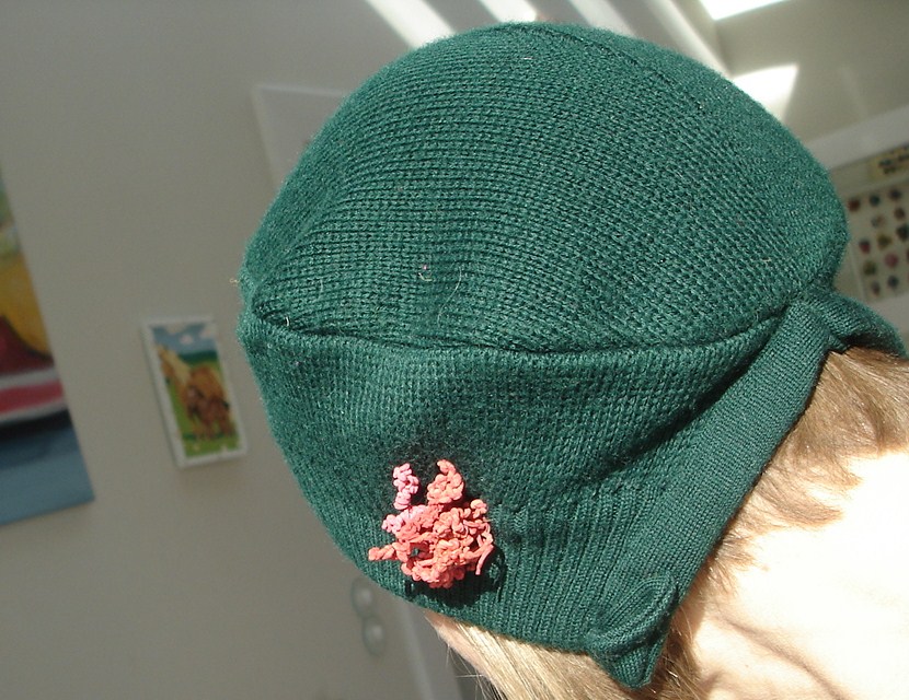 Die Mütze wurde nie getragen und war für mich viel zu eng. Die Grundform entspricht der Annekata-Mütze. Ich habe sie hinten aufgeschnitten und die offenen Kanten mit dem Schleifenband versäubert.