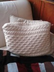 Zum Schluss noch ein Kissen, das ich bestimmt schon 15 Jahre besitze. Es ist aus einem Zopfpullover genäht, den ich noch während meiner Schulzeit gestrickt hatte. Er sah an mir unmöglich aus. Deshalb stricke ich auch nicht mehr – man weiß ja immer erst, was man fabriziert hat, wenn das Teil von der Nadel kommt.