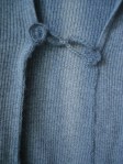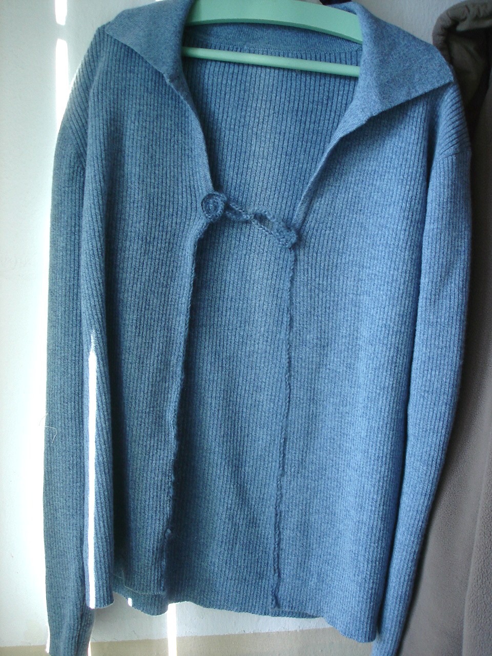 Nun zu einem der aufgeschnittenen Pullover von hier. Ichhatte ja den Fehler gemacht, gleich zu schneiden, ohne vorher links und rechts der geplanten Schnittlinie die Maschen mit einer Nähmaschinennaht zu sichern. So lagen die Kanten offen, und mir bliebt nur, sie mit der Hand und einem gehäkelten Luftmaschenband zu versäubern.