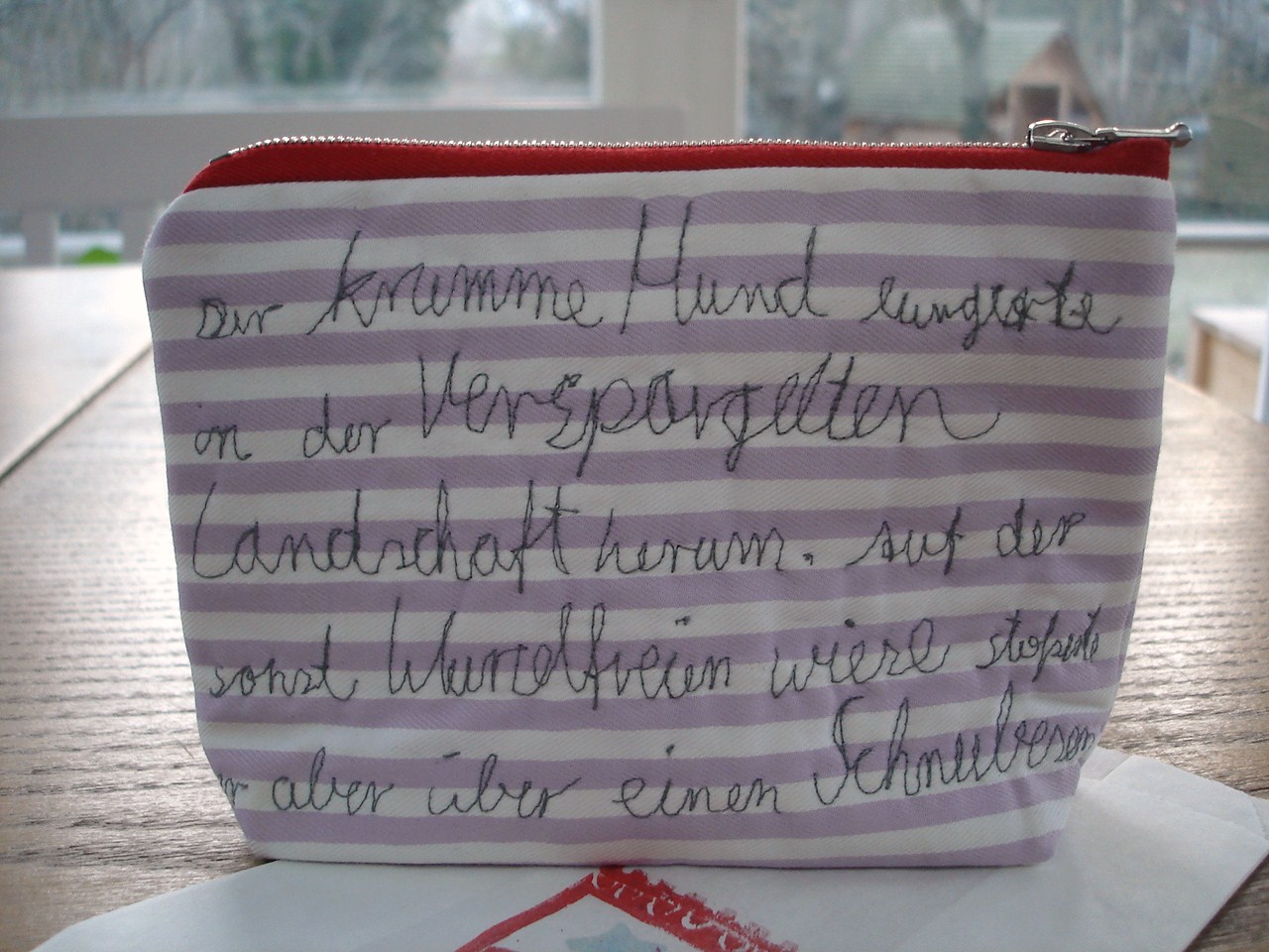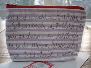5. Verspargelt hatte ich auch noch nie gehoert. Und obwohl ich persoenlich schraege Voegel lieber mag als krumme Hunde wuerde ich die Geschichte so gerne zu Ende lesen. Ich bin sehr beeindruckt. Bis ich im Englischen so eine erfinderische Geschichte schreiben koennte, wird noch viel Wasser den Rhein runterfliessen. Schoen das Streifentaeschchen! Und die gestickten Worte….Die Geschichte der Unterwaesche muss bis heute Abend warten.