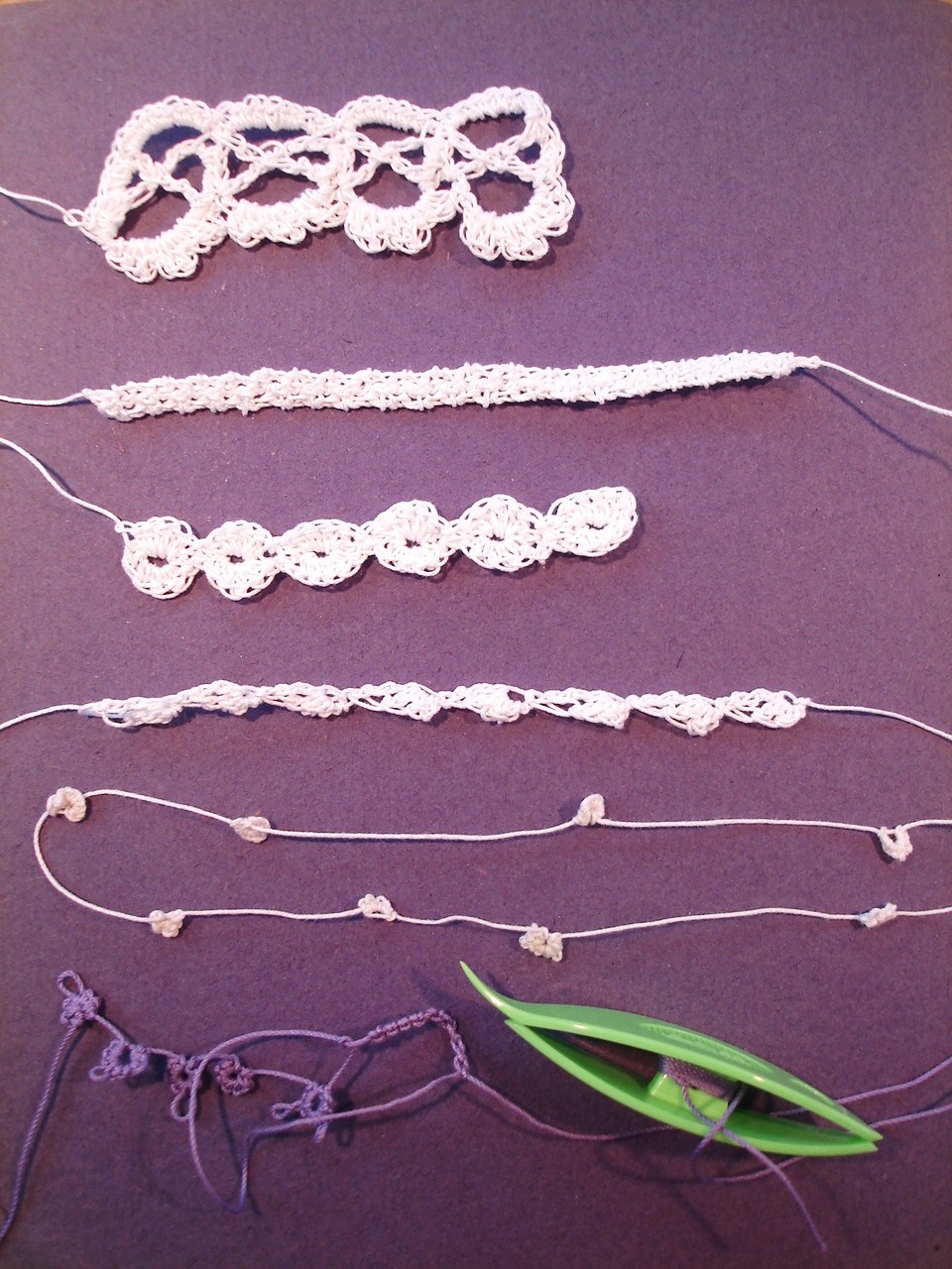 Erste Versuche, Häkelspitze nach alten Vorlagen herzustellen – und Fortschritte in der Arbeit mit einem Schiffchen, auch genannt Occhi bzw. Frivolitätenspitze.   Bei Wikipedia heißt es zu Occhi und zum Knüpfen: