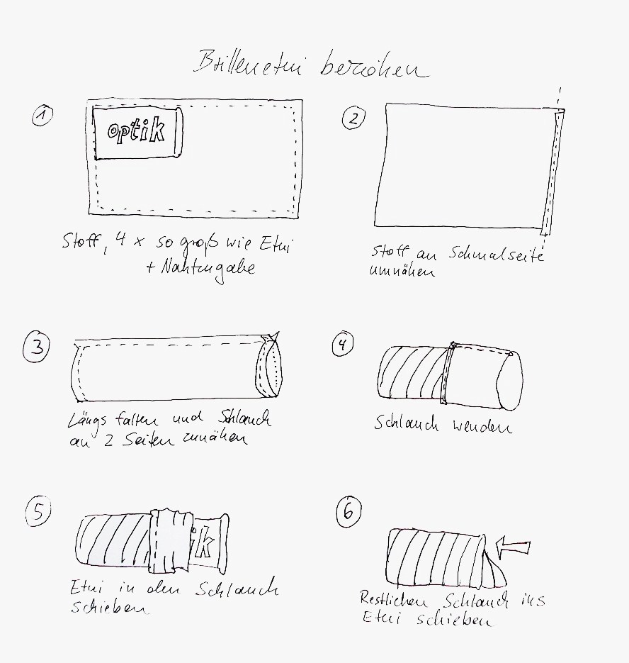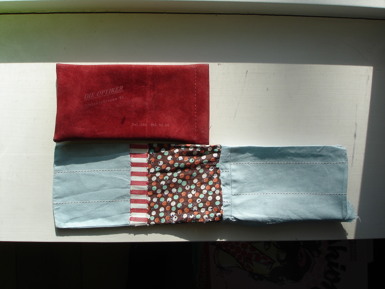 Man näht einen langen Schlauch, der an einer Seite offen bleibt. Das Etui schiebt man hinein und stopft das offene Schlauchende bis zum Boden des Etuis. So sind Brillen ansehnlich verpackt und der Bezug läßt sich jederzeit zum Waschen wieder abziehen.