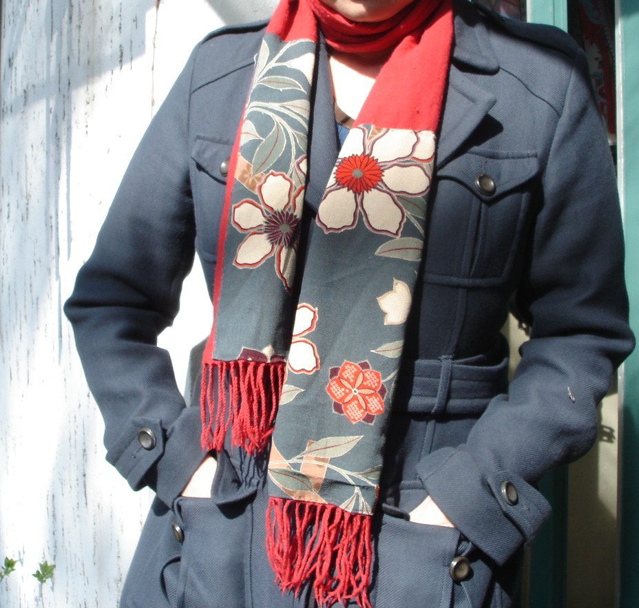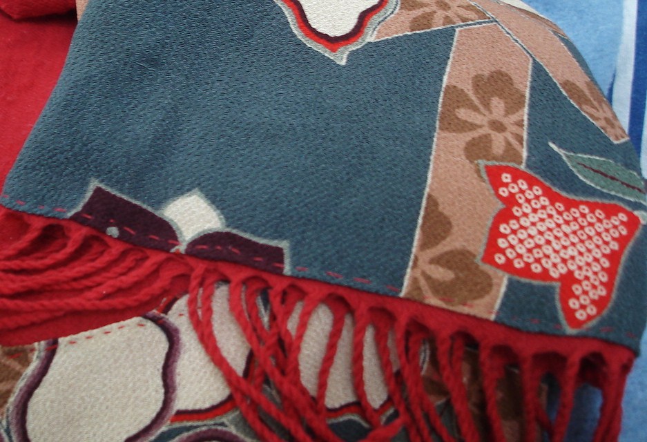 Mit dem fertigen Schal bin ich sehr froh. Die anderen Kimonostoffe werde ich hoffentlich irgendwann ähnlich in Szene setzen können. Wer auch gern solche Reste hätte: In Berlin habe ich letztes Jahr auf der Textile Art einen Stand gesehen, an dem Stücke von Kimonostoffen verkauft wurden. Vielleicht weiß ja noch jemand Näheres oder kennt andere Quellen.