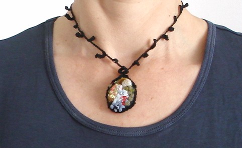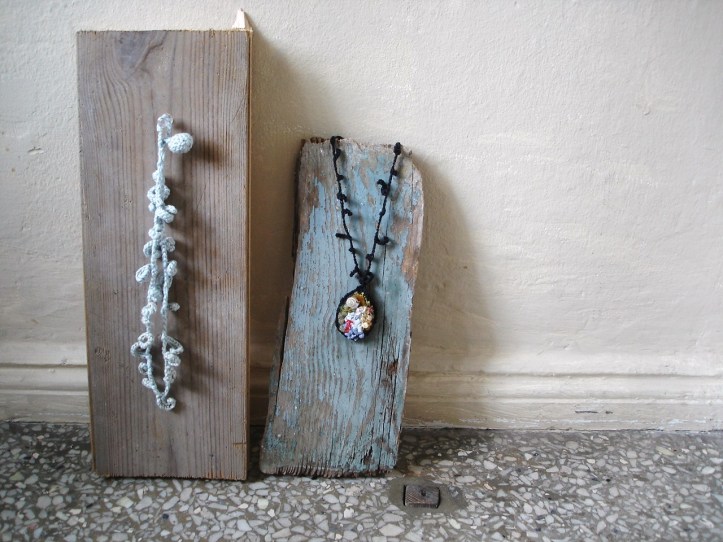 Ob der neue Anhänger vom Foto oben Aura hat, weiss ich nicht. Ich finde ihn aber ganz schön. Auf jeden Fall enthält er auch wieder Textilien „mit Geschichten“ – die kenne nur ich.