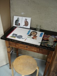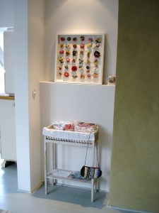6. Ich vermute den Teaser ja in einer ganz anderen Richtung – nämlich in etwas, das im Showroom hängt (nur fertige Sachen wandern in den Showroom, richtig? alles andere ist noch in Arbeit). Der Raum ist wirklich traumhaft, so viel Platz, so schön und praktisch eingerichtet, ein bißchen ordentlich, ein bißchen verkramt, genau so würde ich mir das auch wünschen. Werd schnell gesund, so dass du ihn auch nutzen kannst!