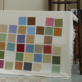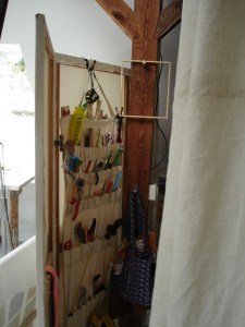 Auf der Rückseite des Paravents (gebaut aus drei bespannten Keilrahmen, Scharnieren und Holzknöpfen für die Füße) hängt ein Utensilo, das ich ständig nutze. Ich werde auch für die nötigsten Nähsachen noch so ein Utensilo anbringen. (Gibt es z.B. hier bei Boesner).