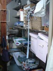 Hinter dem Vorhang dann befindet sich der leicht zugängliche Stauraum, der aber erst noch weiter eingerichtet werden muss. Jedenfall stehen da Schneidemappe und Papierschneider immer parat, was eine große Erleichterung ist.  (Sieht man nicht so gut: „Überzüge“ für Regalbretter, so dass unterhalb des Bretts Papier o.a. wie in einer Hängematte lagern kann).