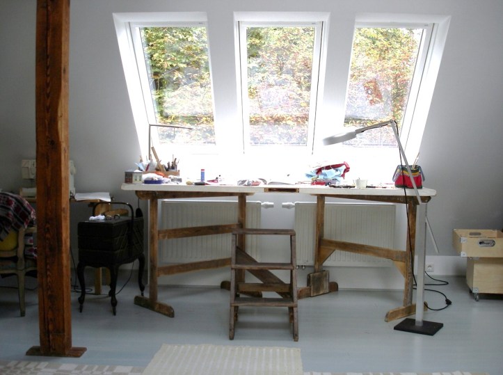 Am schönsten ist für mich dieser Tisch unter dem Fenster, bestehend aus einem alten Türblatt und zwei hohen Böcken, so hoch, dass man auch gut stehend arbeiten kann.