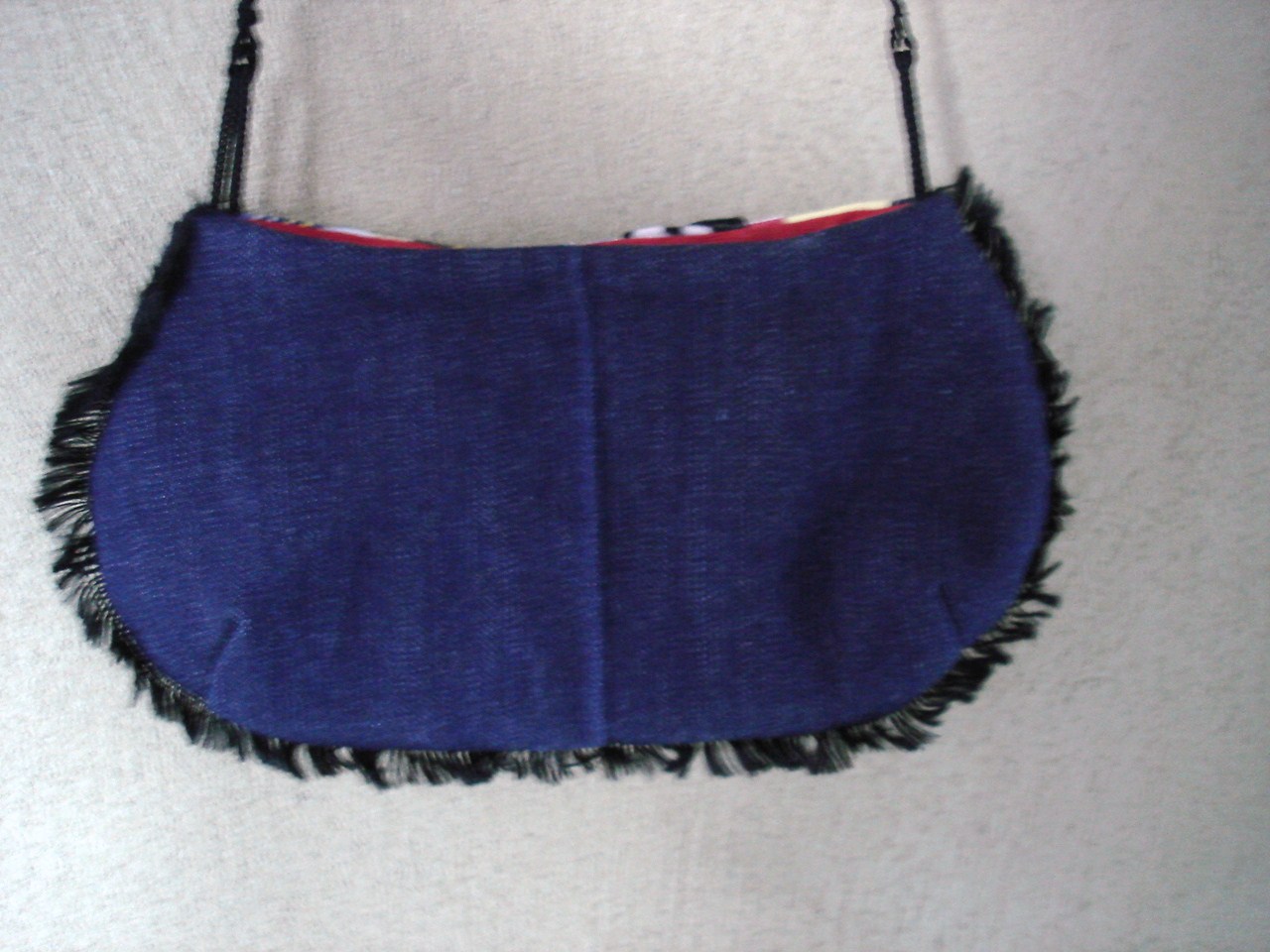 Das Originaltäschchen hat eine Schlaufenborte rundherum, die ich eigentlich toll finde. Meine Idee mit den Fransen war nicht so gut, weil es extrem schwer war, sie zu bändigen (und mit der Hand anzunähen). Der Henkel ist gehäkelt. Die ursprünglich vorgesehenen Lederschlaufen an der Tasche habe ich nicht festnähen können, daher sind es nun schnöde Schnürsenkelstückchen.