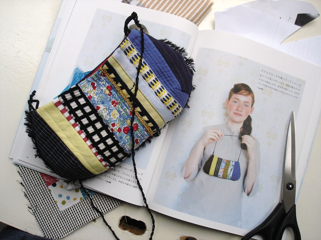 Unglaublich, du hast das Täschchen tatsächlich quasi nachgebaut und bist der Vorlage so nahe gekommen, wie es nur überhaupt geht. Deine Stoffanalyse könnte von mir sein, so saß ich auch immer wieder vor der Abbildung und vor meinen Stoffstreifen. Aber so sehr dem Original entsprechende Stoffe habe ich nicht in meinem Vorrat. Erst jetzt, wenn ich auf dem ersten Bild die Buchseite im Hintergrund sehe und die Tasche mächtig verkleinert, fällt mir überhaupt auf, dass sich bei den Streifen immer hell und dunkel abwechselt. Das sieht man gar nicht, wenn man das Bild immer nur aus der Nähe betrachtet.