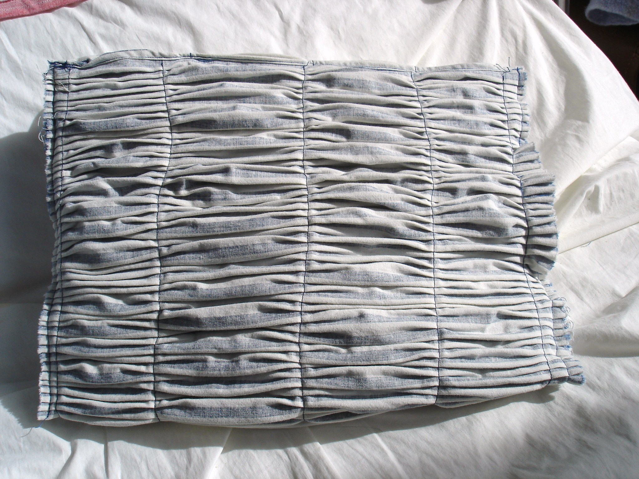 Bei mir habe ich ausrangierte gestreifte Ikea-Bettwäsche benutzt, die schon ziemlich verwaschen war. Durch die Faltungen fällt die ausgewaschene Farbe gar nicht mehr auf. Bei dem Quadrat unten rechts habe ich die Falten scharf aufgebügelt. Solche Quadrate könnte man auch gut in Quilts einarbeiten.