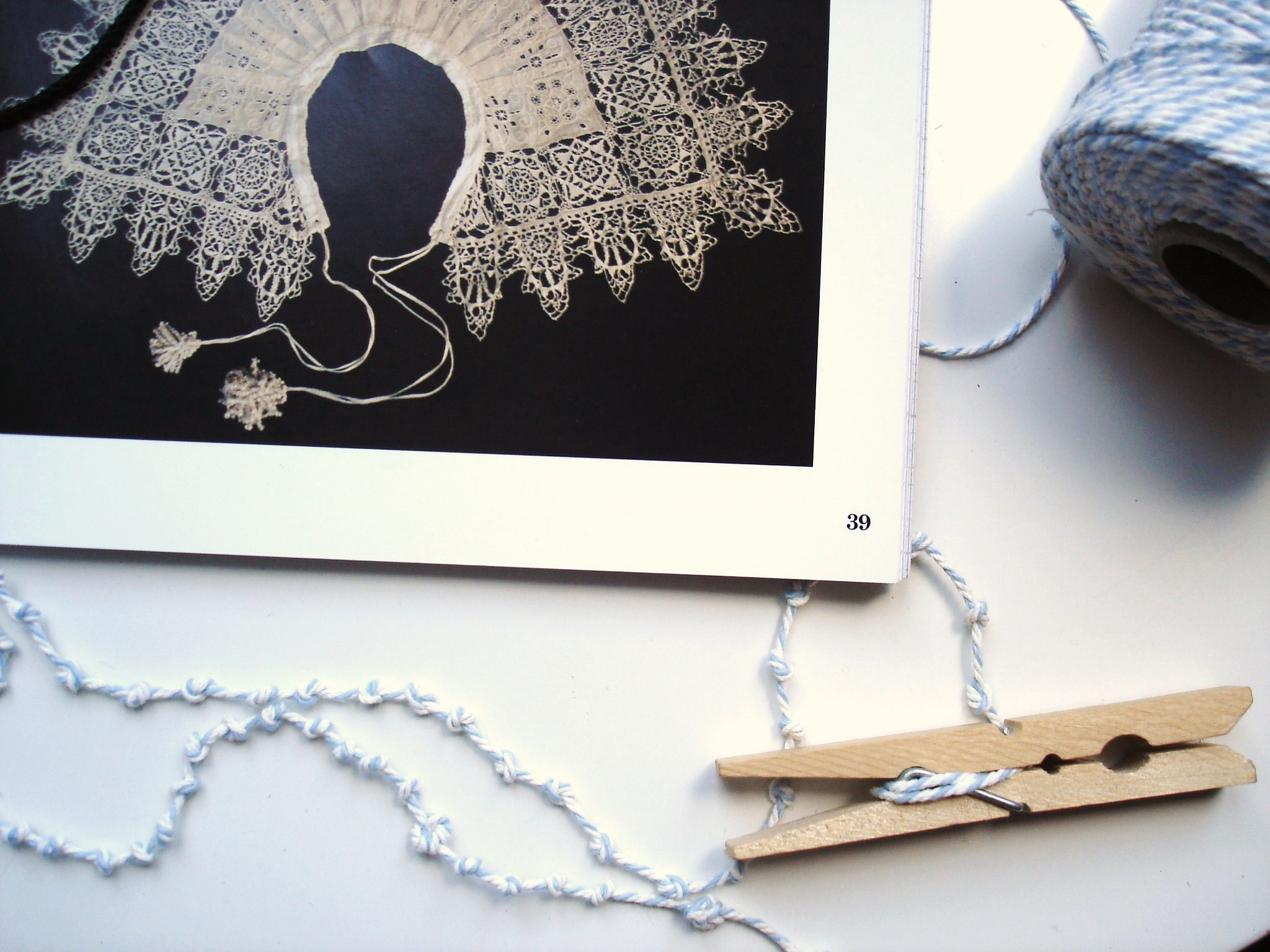Nun habt ihr die rätselhafte Handarbeit ja schon enttarnt: Die Frauen machen Knoten in Schnüre. Ich hatte auch noch nie etwas davon gehört. Im V&A waren mir Troddeln an einer Halskrause aufgefallen (so wie in dem Buch auf dem Foto oben), die aus geknotetem Band bestanden. Es sah sehr besonders aus. Inzwischen habe ich versucht, solche Troddeln nachzumachen. Weil ich natürlich nicht so ein großes Schiffchen besitze wie die Frauen auf den Bildern, habe ich eine Wäscheklammer mit Band umwickelt und probeweise Knotenschnüre hergestellt.