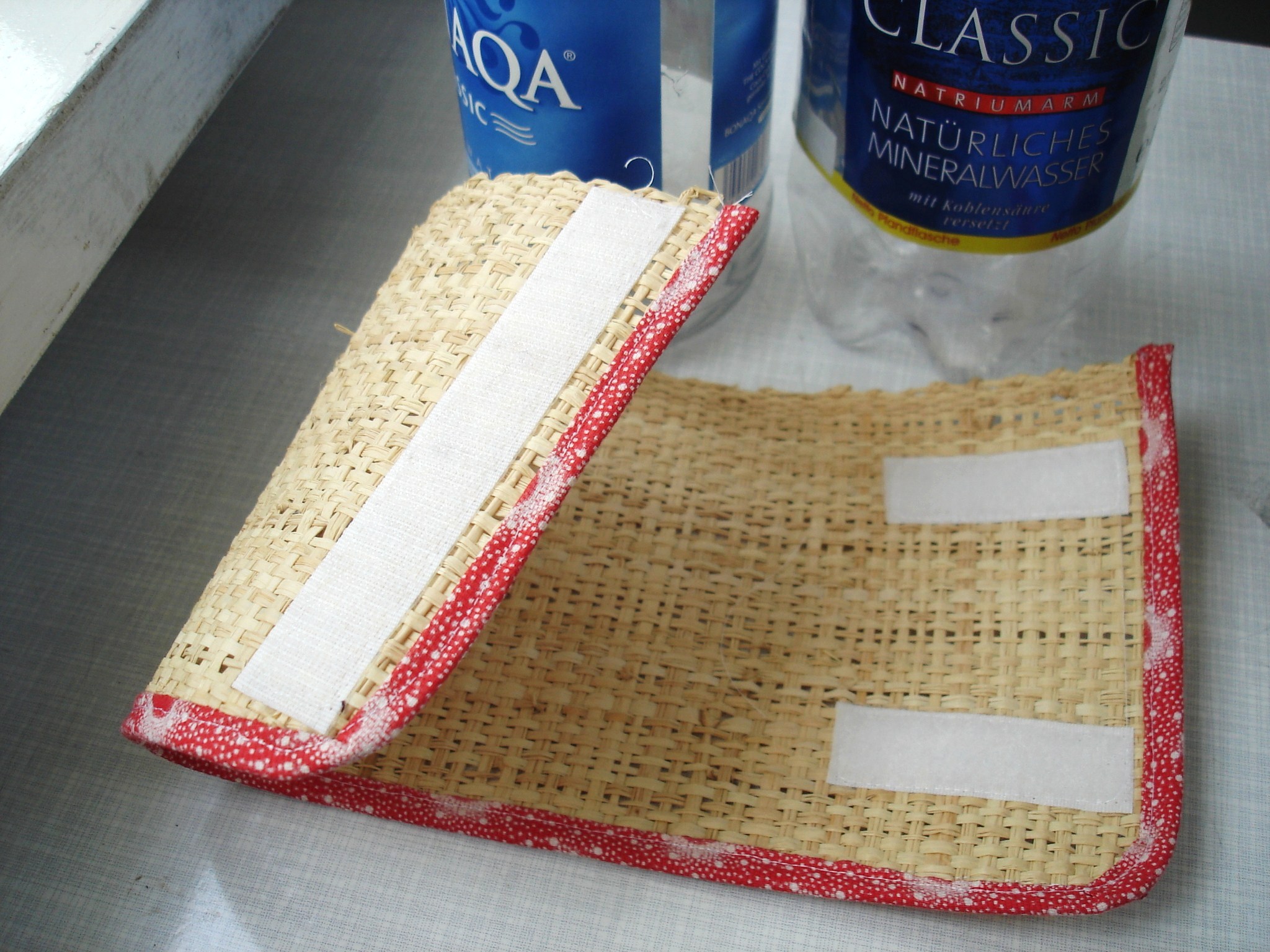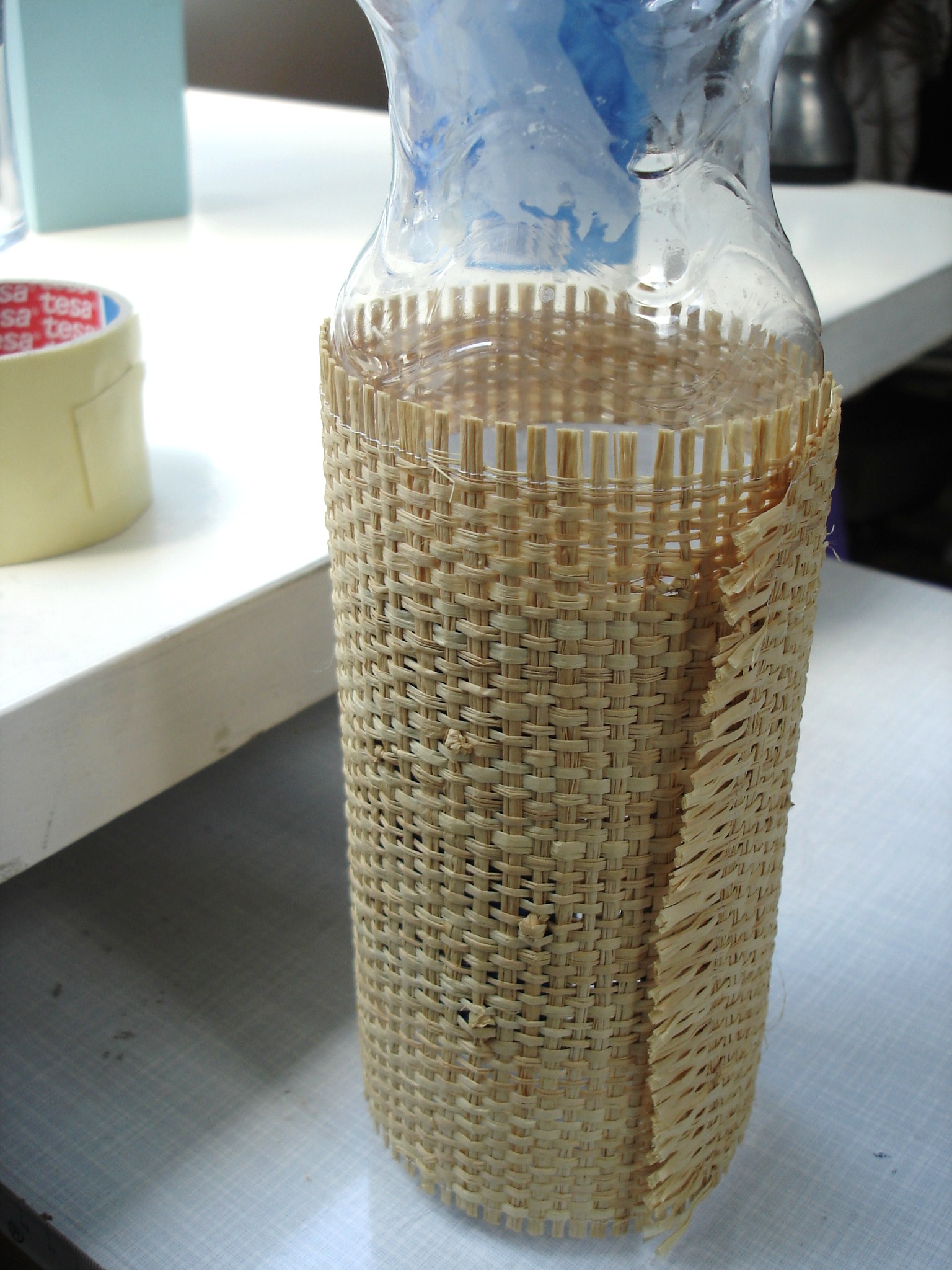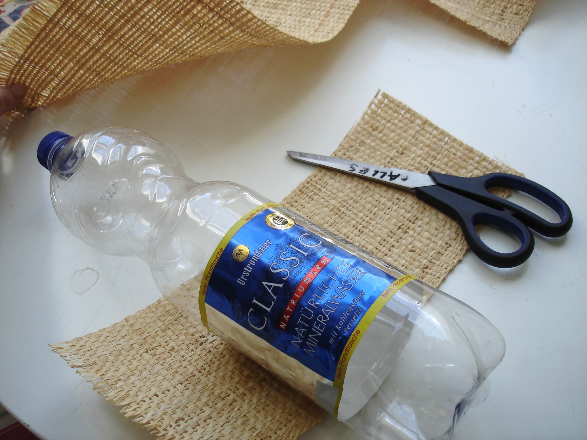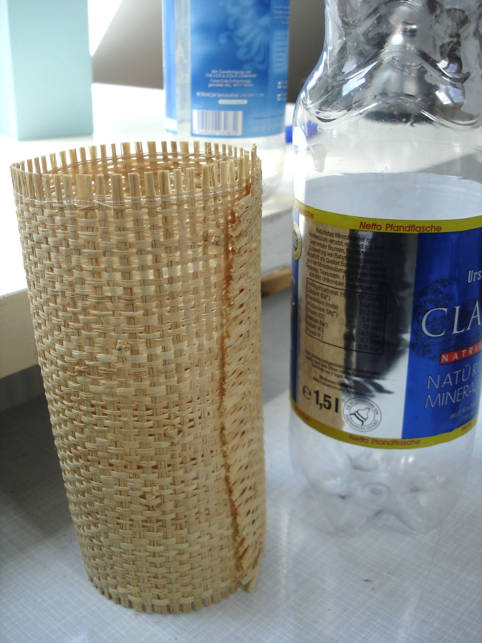 Bastmatte von Modulor – daraus ein Rechteck auschneiden, das großzügig überlappend einmal um die Flasche gelegt werden kann.