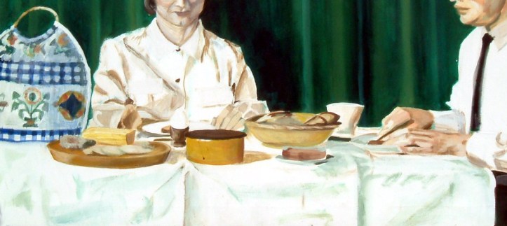Dieses Bild (hier ein Ausschnitt) habe ich vor langer Zeit gemalt. So kenne ich es von zuhause: Tischtuch gemangelt, Butter in einer Butterdose, Aufschnitt ausgewickelt und ausgelegt, Brot im Brotkorb, Marmelade im Glasschälchen,  und so fort.  Unter keinen Umständen war eine Verpackung zu sehen!