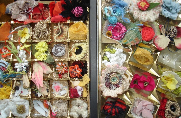 Ich wollte diesmal die vielen Pralinenkästen mit floralen Elementen nutzen, die ich seit meiner Broschenproduktion  aufbewahre. Dann kam bei einer historischen Recherche noch ein zündender Gedanke dazu. Nun hoffe ich, dass ich die Idee auch durchhalte. Diese zwei folgenden Gebilde wären ein „Neugiererwecker“ dafür (keine Ahnung, wie man „Teaser“ übersetzen könnte, fast unmöglich).
