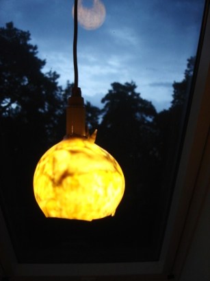 Wir haben ja nicht nur über Schnitte, Abnäher und Romanit gesprochen, sondern zum Beispiel auch über Lampenschirme.  Ich habe von meiner Kinderballlampe  erzählt und liefere nun noch Bilder nach.   (Die geht so: Einen alten Plastikball nehmen, wie ein Frühstücksei mit Messer oder Schere köpfen, umstülpen, für die Leuchte ein Kreuz einschneiden und hochbiegen, Birne durchstecken.)  Tagsüber ist die Lampenkugel weiß, abends dann schön indirekt gemustert.