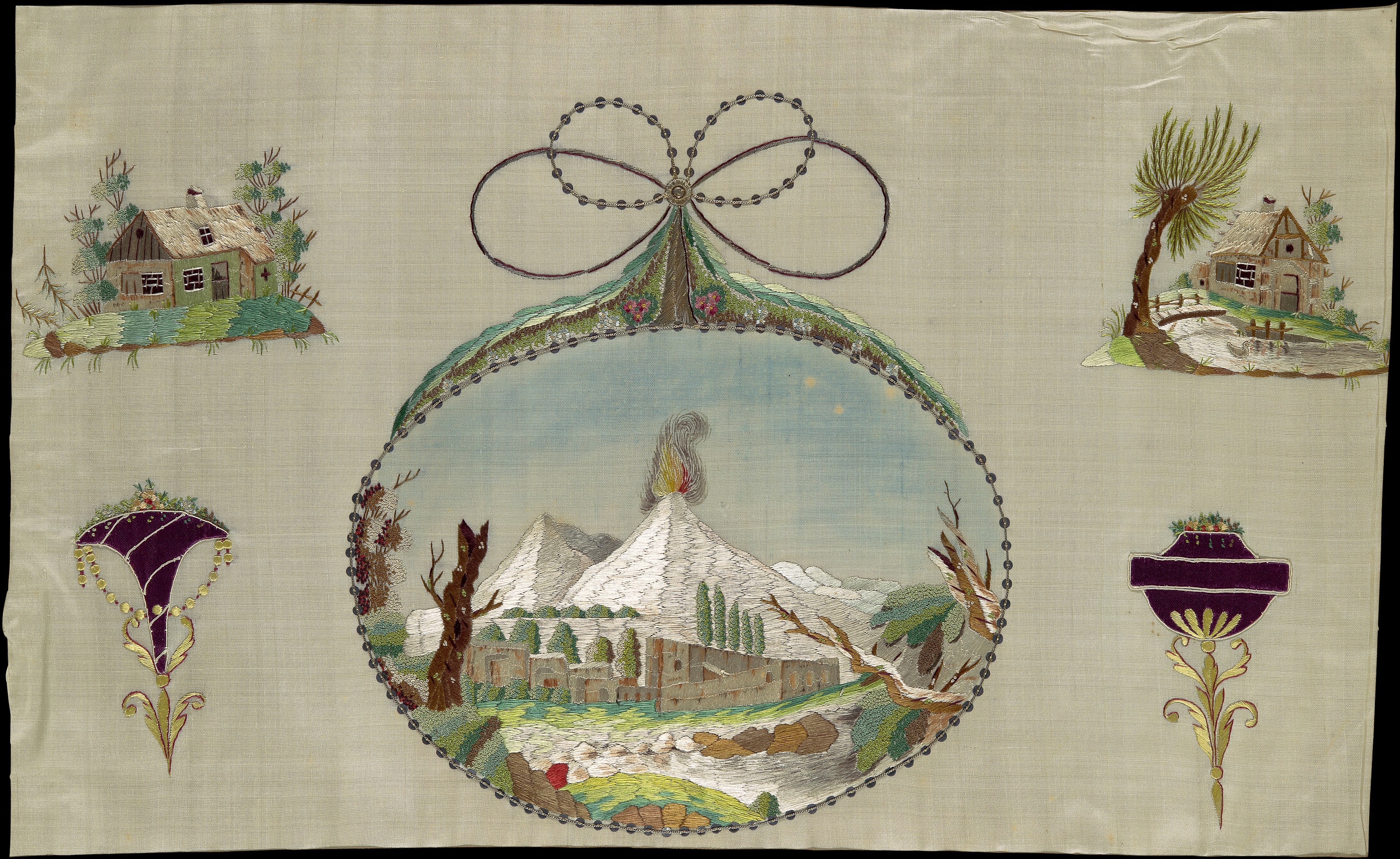 Ein brodelnder Vulkan? Er ist Teil eines Stickbuchs aus der Zeit um 1800.  „Zeichen-Mahler und Stickerbuch zur Selbstbelehrung für Damen, Zweiter Theil“ von Johann Friedrich Netto. Und daneben dann unten rechts auch noch ein Sarg? Gegenüber ein Füllhorn?