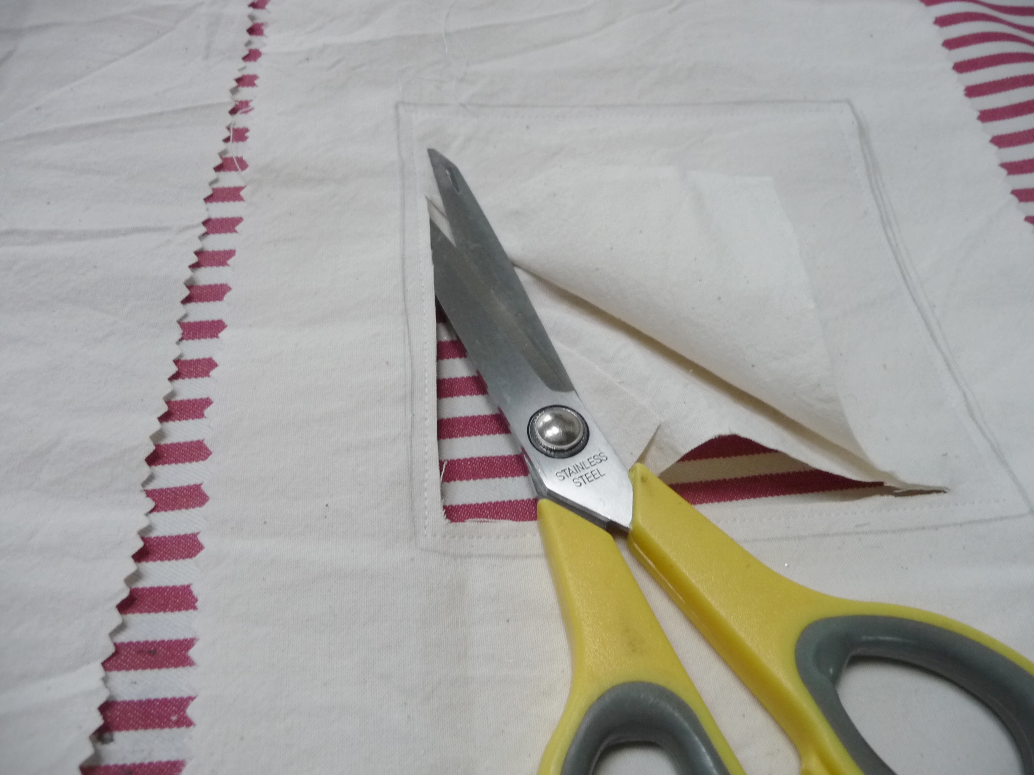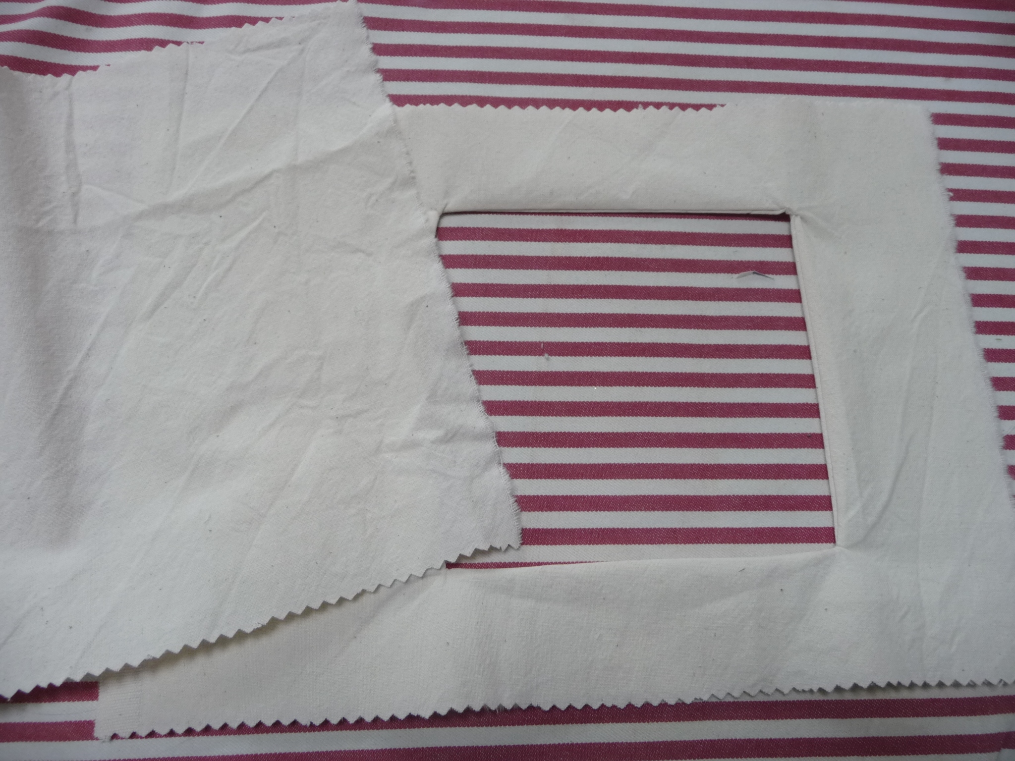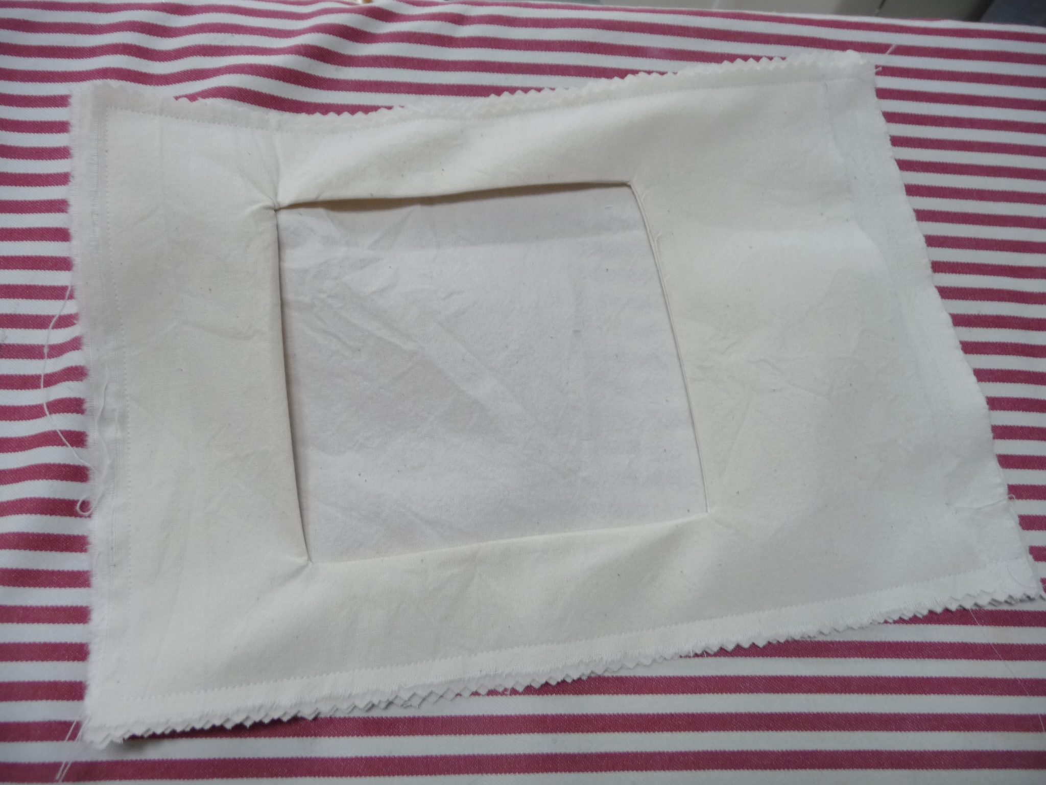 Die Oberseite mit dem Ausschnitt besteht aus einer doppelten Lage Stoff. Darauf zeichnet man den gewünschten Ausschnitt und näht die Vorzeichnung einmal rundherum ab. Das Innere des Ausschnitts wird nah der Nahtlinie ausgeschnitten und dann der so entstandene Rahmen gewendet.