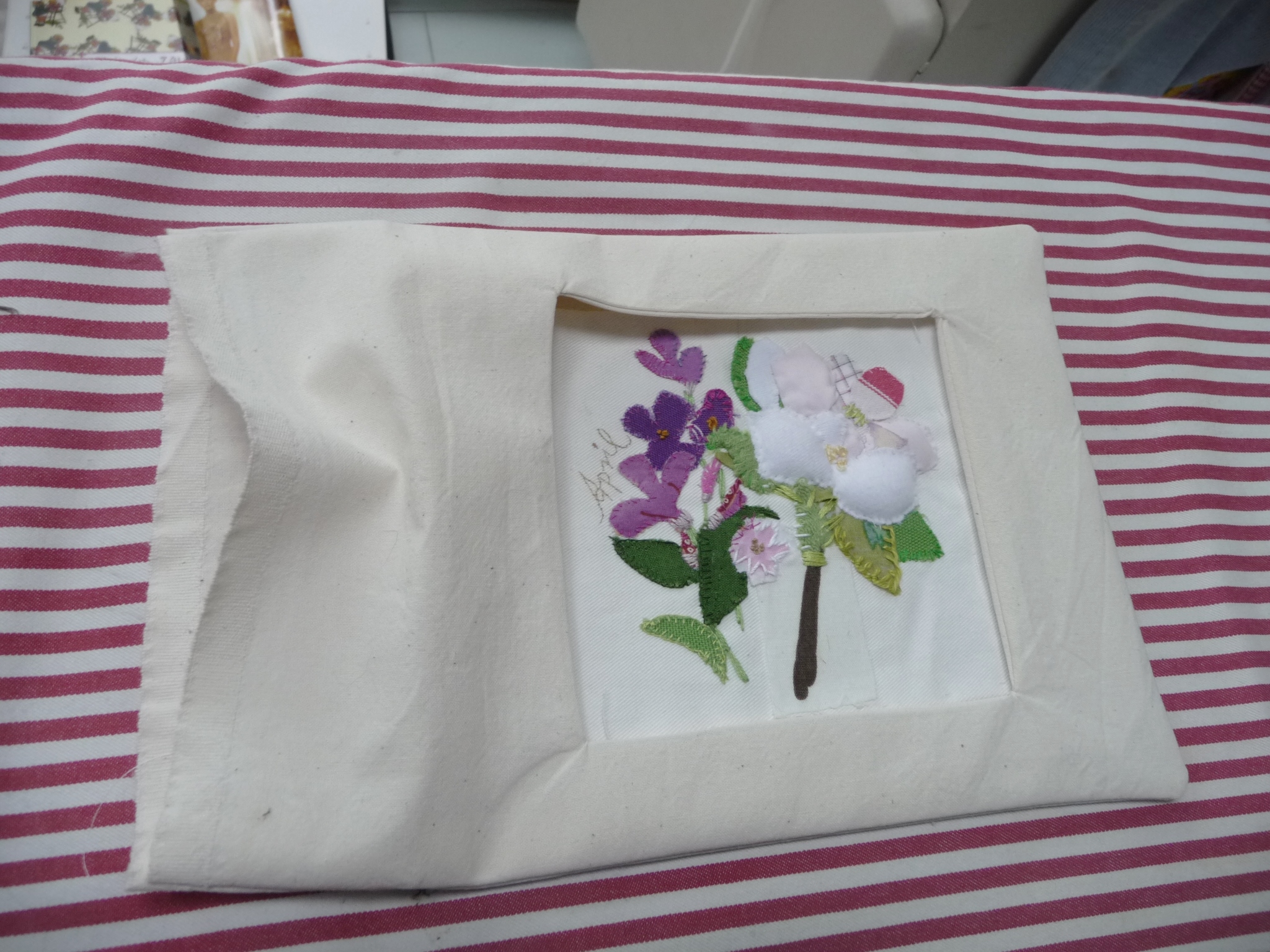 Nun den Rahmen auf eine dritte Lage Stoff aufnähen (eine Seite offen lassen) und alles wenden. In die Öffnung kann man nach Belieben seine Werke einschieben und/oder feststecken, eventuell mit einer Pappe dahinter noch stabilisieren. Die offene Seite kann man nach hinten umschlagen oder (versäubert) offen lassen.
