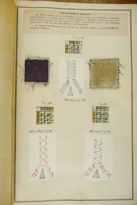 Ich finde die Seiten ja nicht nur technisch und historisch von Interesse – ich finde sie auch einfach nur schön anzusehen. Außerdem hilft das Anfassen und Anschauen von Proben. Hätte ich ein Buch, in dem alle Stoffarten eingeklebt sind, könnte ich mir endlich unter all den Stoffbezeichnungen etwas vorstellen.