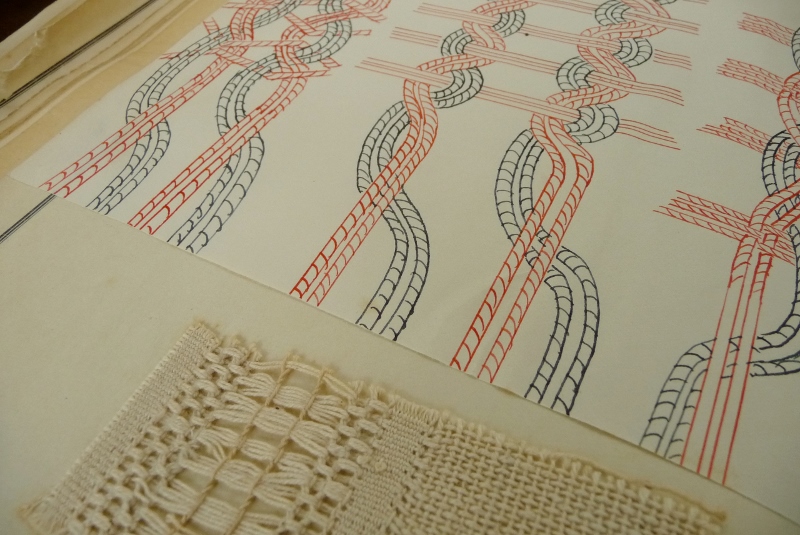 Ein paar Funde vom Quilttreffen am letzten Sonntag wollte ich euch nicht vorenthalten. Das sind keine Entwürfe für Patchworkdecken – obwohl das eine gute Idee wäre. Das sind Zeichnungen, die angehende Weberinnen in ihren Ausbildungsheften anfertigten.