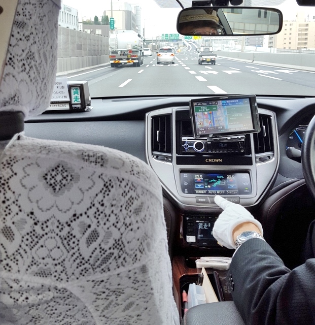 Auch kurios: Edel-Taxi mit Spitzenüberzug auf den Sitzen. Eine Übernahme westlicher Dekovorstellungen? Wenn man „Japan“ und „Spitze“ googelt, kommen nur Hunde, die Japanspitze heißen.