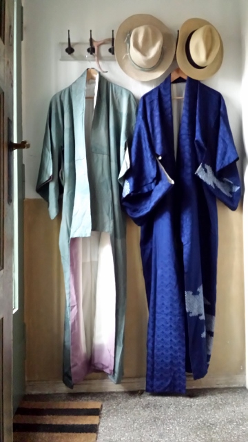 Drei davon sind inzwischen in Berlin, einen will ich mir zum Kleid umarbeiten. Der Kimono links ist im Futter ganz wunderbar fliederfarben eingefärbt.