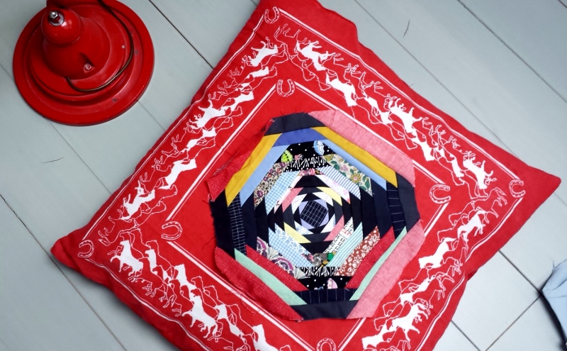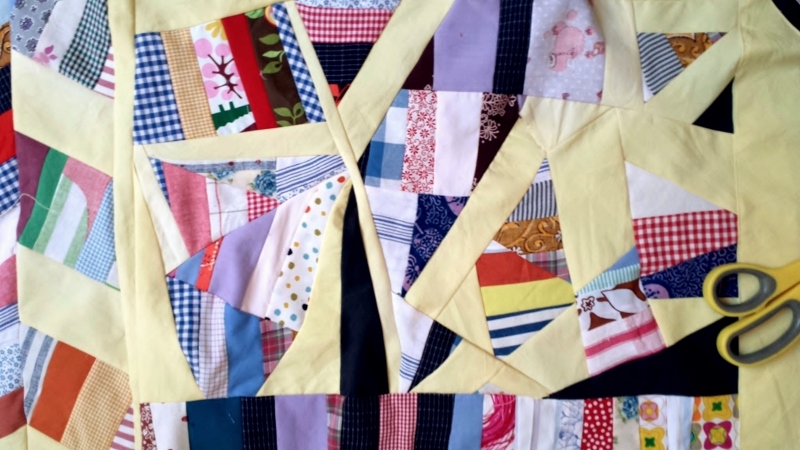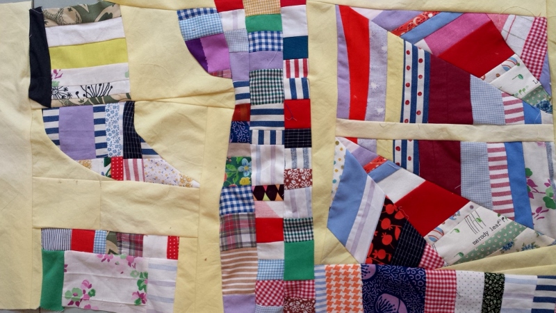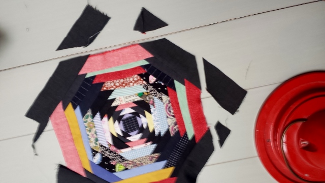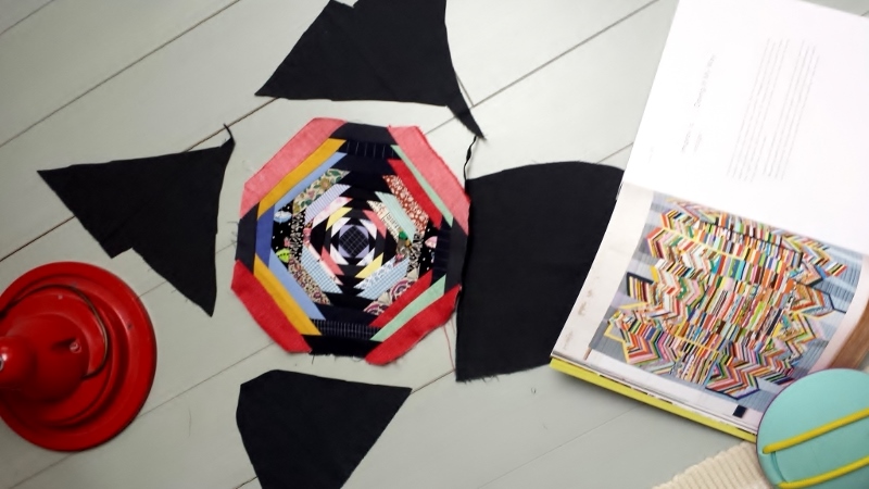 Vor Jahren schon wollte ich nach einem Quiltspotting (Quilts in Filmen) das Pineapple-Muster versuchen. Ausgehend von einem Quadrat näht man viele schmale Stoffstreifen abwechselnd über Eck. Ich habe mich für je eine Reihe bunte und eine Reihe dunkle Stoffstreifen entschieden.
