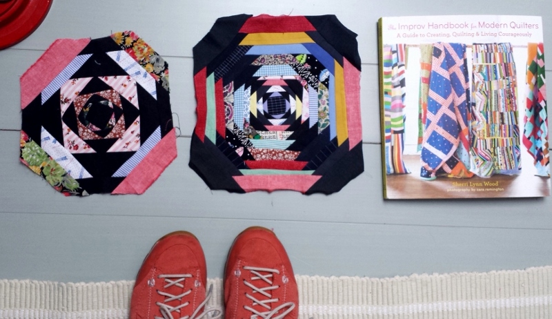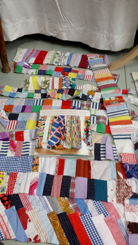 Sherri Lynn Wood, The Improv Handbook for Modern Quilters. Sherris Improvisationsrezepte habe ich ja früher schon probiert (z.B. Floating Squares oder Stimmungsquilt). Von damals stammen auch noch sehr viele Streifen aus Stoffresten. Ich hatte alle Reste nach Breite sortiert und dann jeweils zusammengenäht.