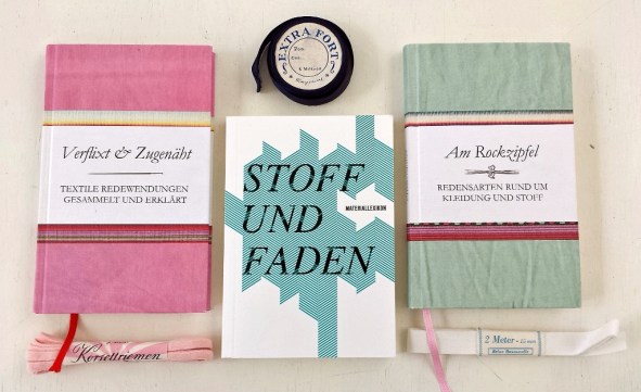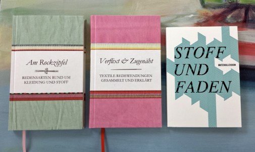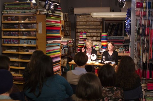 Constanzes und meine erste gemeinsame Lesung fand noch im dunklen Berliner Februar statt. Zum Glück ist Ninas stimmungsvolles Nähkontor eine wunderbare Kulisse für Ausflüge in die textilen Welten der drei Bücher. Auf dem Tablett vor Constanze hat sie sehr interessante Brennproben inszeniert – es zeigte sich, dass man bei der Einschätzung eines Stoffmaterials, z.B. ob Seide oder Kunststoff, ganz schön danebenliegen kann.