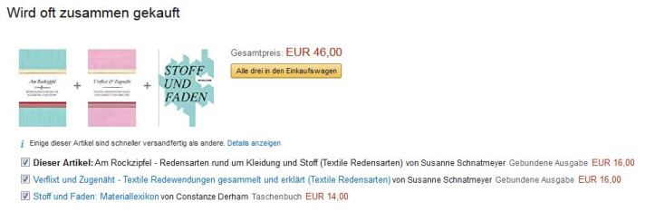 Trotz des bisherigen Erfolges scheint mir aber die letzte Hürde schwer zu nehmen: Die Bücher auch in die Auslagen der Buchhandlungen zu bekommen. Da sind die großen Verlage klar im Vorteil (und zahlen wohl auch für die besten Plätze). Meine beiden „Pralinenschachteln“ hatte ich ja extra so gestaltet, dass sie schön anzusehen sind und schön in der Hand liegen – das bringt natürlich nichts, wenn man sie sich nur digital anschauen kann. (Zumal z.B. bei Amazon die Farben ganz falsch sind – und alle meine Versuche, das zu korrigieren, dort ignoriert werden). Auf jeden Fall hat Amazon aber festgestellt, dass unsere Werke gern zusammen gekauft werden. Da wünsche ich Constanze noch ganz viel Umsätze, in der Hoffnung, dass ich dann auch hin und wieder mit im Einkaufskorb lande :)