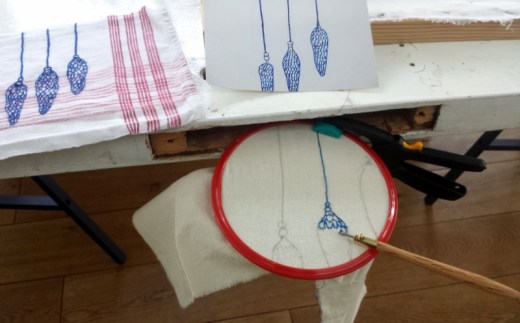 Unten seht ihr ein Stück Baumwollnessel im Stickrahmen – mit einer Klemme am Tisch befestigt, so dass man beide Hände frei hat, die Nadel und den Faden zu führen. Ich habe schnell aufgegeben, der Stoff war viel zu fest und das Muster zu kompliziert.